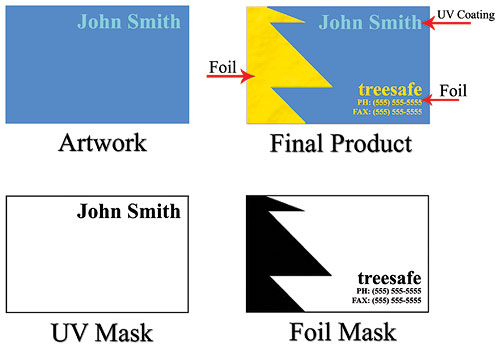 We can only use one type of foil per order so for example you can not order a Foil Worx job with Gold foil on the front and Silver foil on the back. Foil job files are set up just like our Spot UV job files. You must provide a separate Foil mask file: black in the areas you want the foil and white in the areas you do not want the foil. All black areas should be solid 100% K with no other added colors. If you order a Foil Worx job with Spot UV, you'll need to provide separate mask files for the Foil (foil mask) and UV (spot uv mask), in which case you may be required to provide up to 6 files. Please keep in mind, however, that the Foil and UV coating can't overlap, both should be at least 1/16" apart to avoid foil peeling off. Also, avoid using small / fine text or lines for foil objects. For best results, please make sure that foil coverage is less than 50% of the entire print side. Also, be aware that there may be up to a 1/16" shift on the placement of the foil. Keep this in mind if you are trying to align foil with other printed artwork on the card.